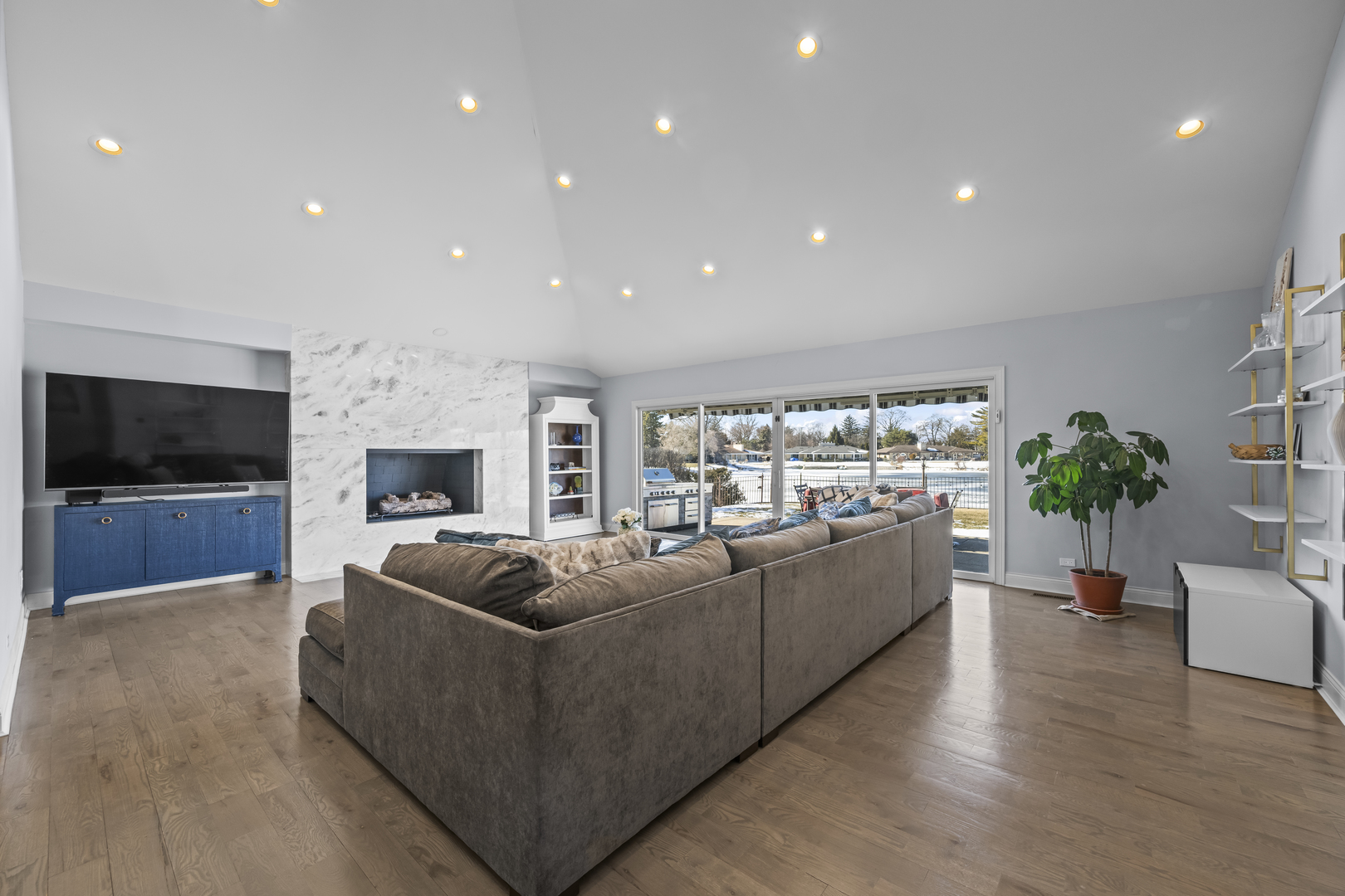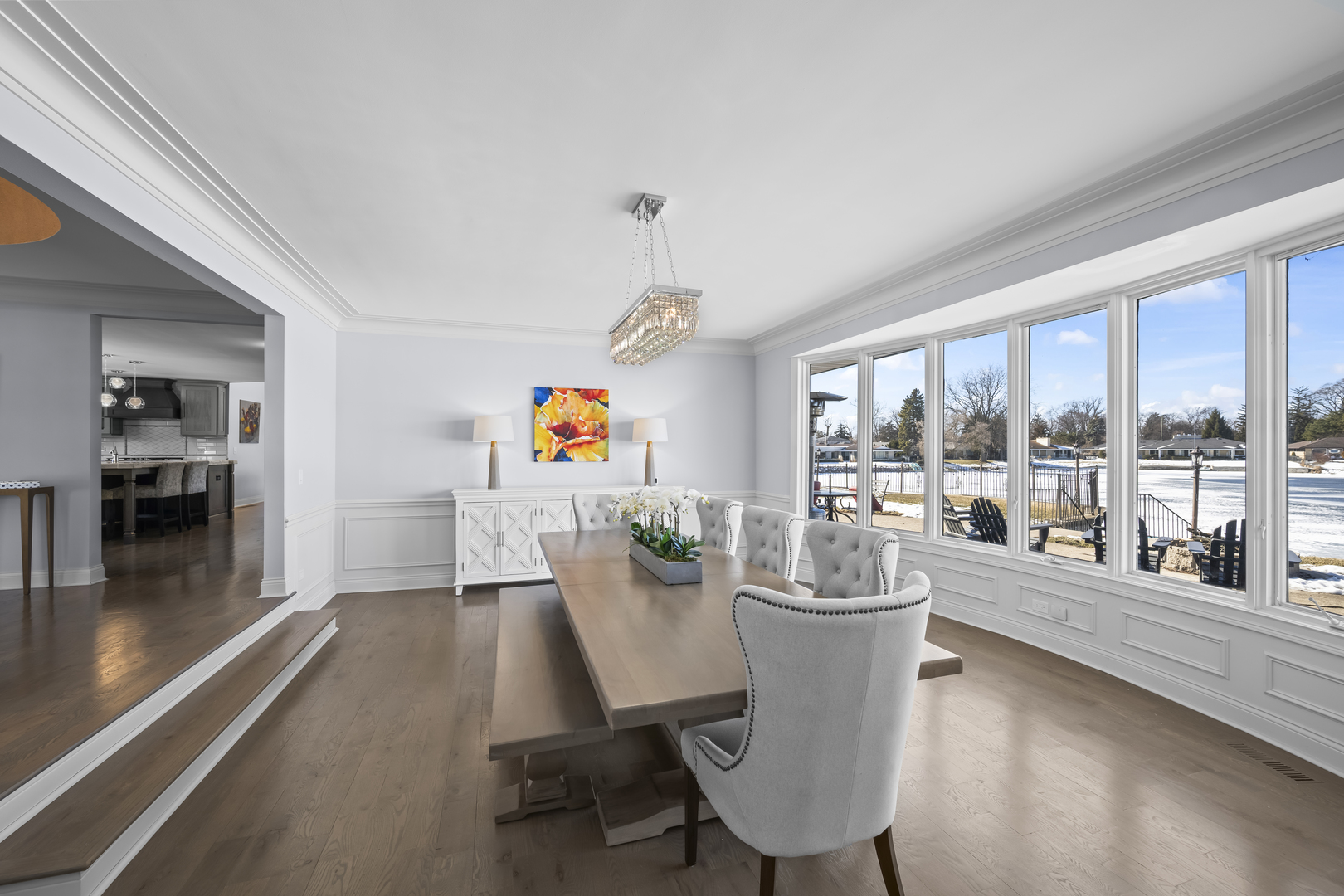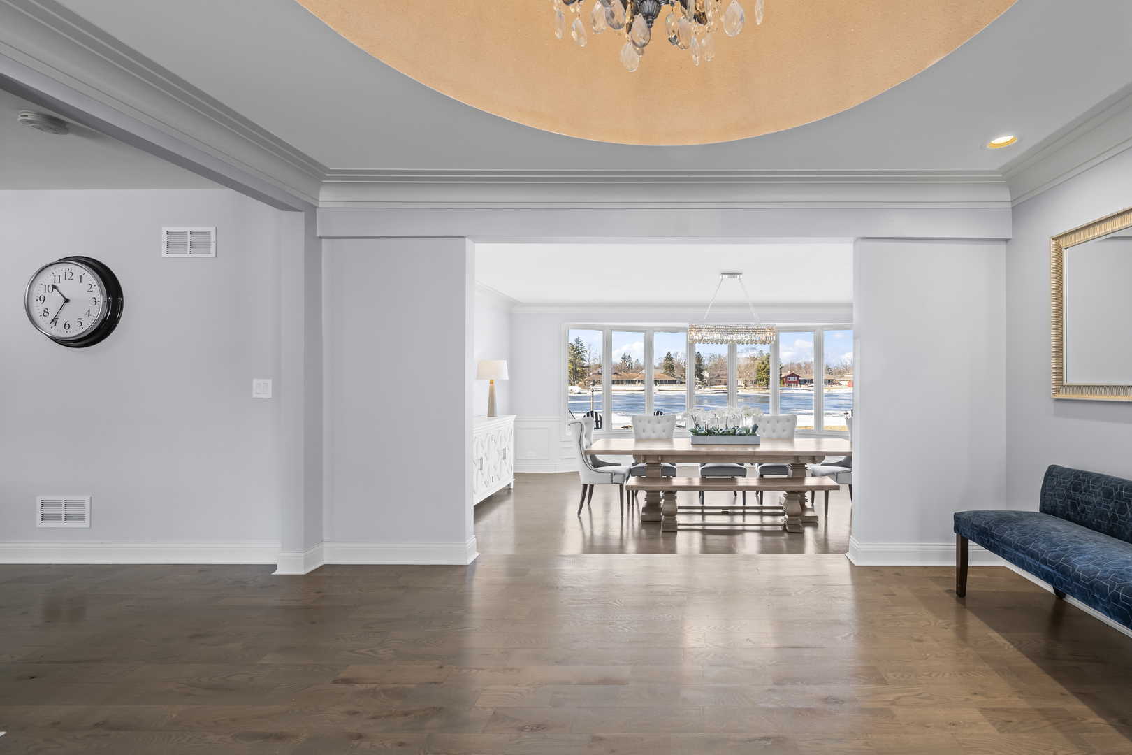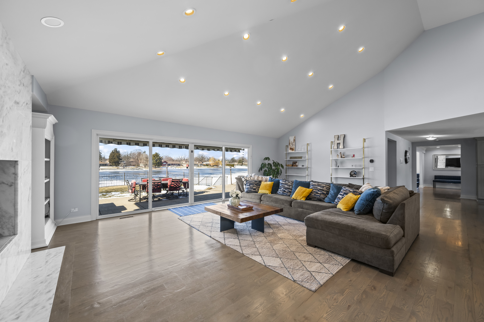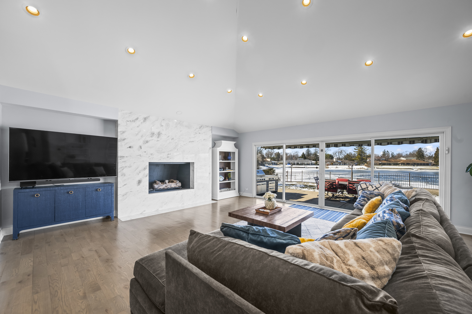 One-of-a-kind waterfront sprawling ranch set on the private shores of Lake Shagbark. This extraordinary home captures breathtaking water views from nearly every room, creating a serene and picturesque backdrop throughout. Thoughtfully and professionally designed from start to finish, every detail reflects exceptional craftsmanship and refined style. The luxurious kitchen is a true showpiece, featuring furniture-grade custom cabinetry, bespoke countertops, an expansive center island, and professional-grade stainless steel appliances-perfectly blending elegance and functionality. The stunning family room offers soaring vaulted ceilings and a marble-accented fireplace, creating a warm yet sophisticated gathering space. A large formal dining room is ideal for entertaining, while the impressive formal entryway welcomes guests with a beautifully detailed decorative ceiling. Convenience meets luxury with a main-level laundry and mudroom designed for everyday ease. The primary suite is truly one of a kind, offering a private retreat with a spa-inspired bath designed for ultimate relaxation. The finished lower level expands the living space with an additional bedroom, full bathroom, and an impressive oversized sauna-your own private wellness escape. Enjoy direct, private access to Lake Shagbark, ideal for electric boating, kayaking, canoeing, and swimming. This rare waterfront gem offers an unparalleled lifestyle in a tranquil and exclusive setting.